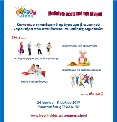 Για περισσότερες πληροφορίες σχετικά με το πρόγραμμα στην ιστοσελίδα www.healthykids.gr/summerschoolκαι στα τηλέφωνα 2431047030 και 6944640035.