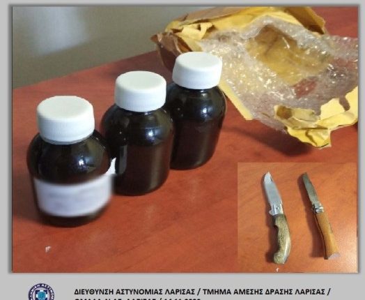 Ειδικότερα, κατά τον αστυνομικό έλεγχο, κατελήφθησαν να κατέχουν -3- πλαστικά φιαλίδια με υγρή μεθαδόνη, συνολικού βάρους -437- γραμμαρίων καθώς και δύο σουγιάδες, τα οποία κατασχέθηκαν.