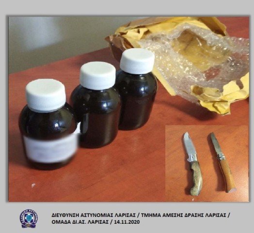 Ειδικότερα, κατά τον αστυνομικό έλεγχο, κατελήφθησαν να κατέχουν -3- πλαστικά φιαλίδια με υγρή μεθαδόνη, συνολικού βάρους -437- γραμμαρίων καθώς και δύο σουγιάδες, τα οποία κατασχέθηκαν.