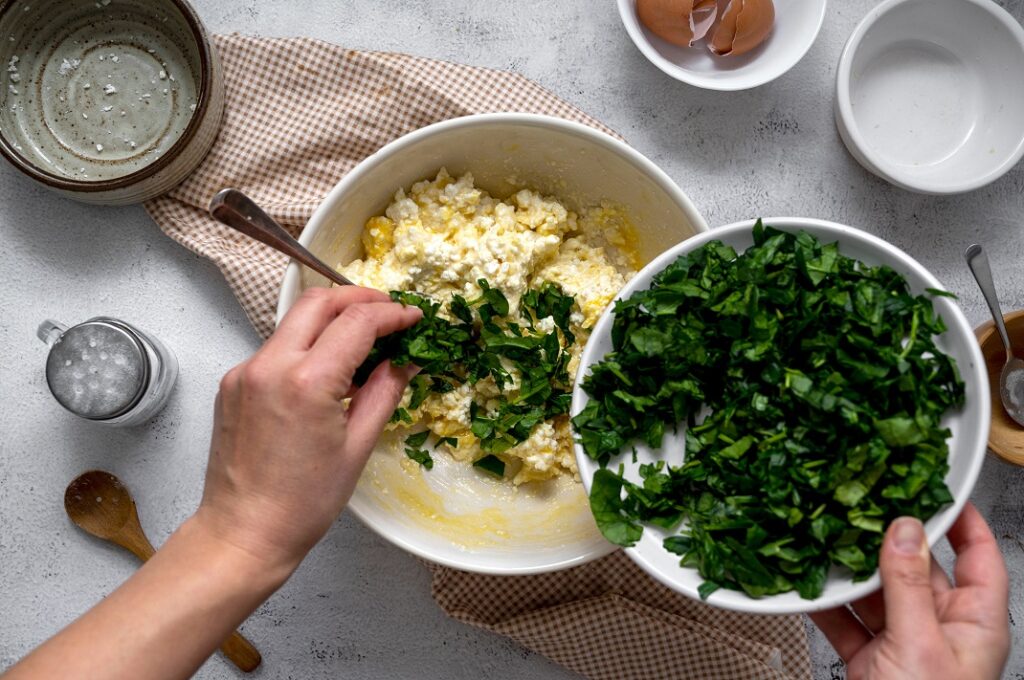 Πλένουμε καλά τα χόρτα και τα αφήνουμε να στραγγίσουν. Τα ψιλοκόβουμε σε ένα μεγάλο μπολ. Κάνουμε το ίδιο με τα φρέσκα κρεμμυδάκια, το πράσο, το ξερό κρεμμύδι και τα μυρωδικά.