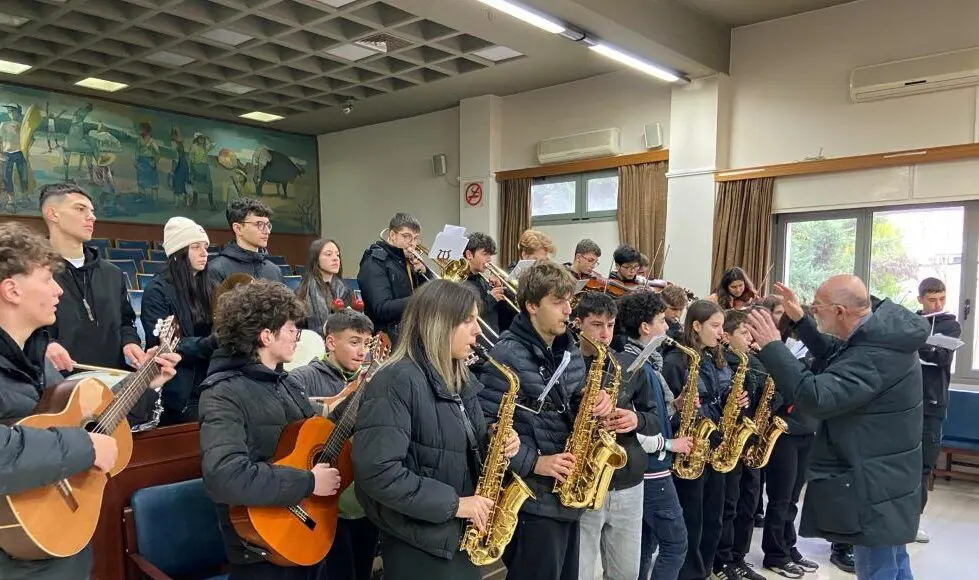 Σαξόφωνα, βιολιά, φλάουτα, κιθάρες, ορισμένα από τα μουσικά όργανα που στα χέρια μαθητών/τριών του Συνόλου Ποικίλης Μουσικής του Μουσικού Σχολείου Τρικάλων, έψαλαν τα κάλαντα στον Δήμαρχο Τρικκαίων Νίκο Σακκά.