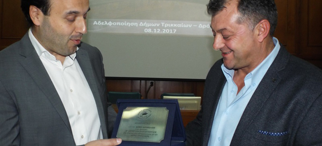 «Αδελφική» στην πράξη η τελετή στο Δημαρχείο Τρικκαίων. Οι Δήμοι Τρικκαίων και Δρόπολης Αλβανίας αδελφοποιήθηκαν επισήμως την Παρασκευή 8 Δεκεμβρίου 2017, με τον αλβανικό Δήμο να πραγματοποιεί με τα Τρίκαλα την πρώτη του παρόμοια διοικητική πράξη. Η αδελφοποίηση είχε συζητηθεί την περασμένη άνοιξη, όταν ο Δήμαρχος Δρόπολης κ. Αχιλλέας Ντέτσικας είχε υποβάλλει την πρόταση στον κ. Δημήτρη Παπαστεργίου. Μετά τις απαραίτητες ενέργειες, το Δημαρχείο Τρικκαίων υποδέθηκε τους εκπροσώπους της Δρόπολης: τον Δήμαρχο κ. Ντέτσικα, τον αντιδήμαρχο κ. Μιχάλη Μάνο και τον νομικό σύμβουλο κ. Ανδρέα Παππά.