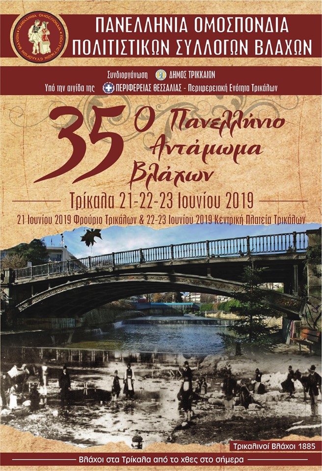 Στις 21, 22 και 23 Ιουνίου 2019 ο Δήμος Τρικκαίων συνεργάζεται με την Πανελλήνια Ομοσπονδία Πολιτιστικών Συλλόγων Βλάχων και συνδιοργανώνουν μια μεγάλη εκδήλωση. Χορός, τραγούδι, έθιμα, παράδοση, ιστορία, μέλλον.. όλες αυτές οι δραστηριότητες αναπτύσσονται μέσα από την τριήμερη διοργάνωση.
