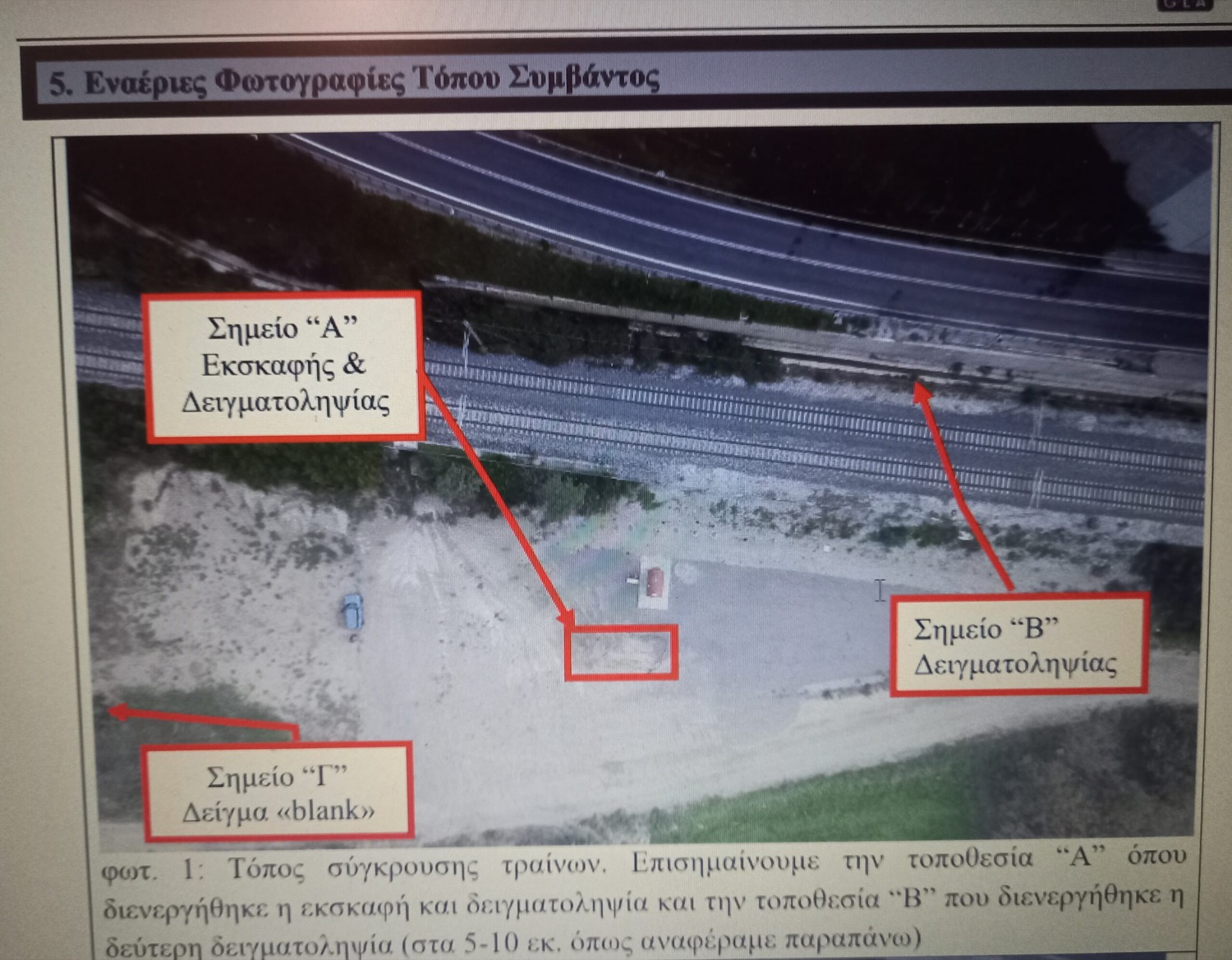 Η δειγματοληψία πλησίον των σιδηροδρομικών γραμμών διενεργήθηκε σε βάθος περί τα 5-10 εκατοστά. Ως εκ τούτο, νοείται ως δεδομένο ότι τα δείγματα τα οποία λήφθηκαν κατά την αυτοψία δεν είναι αντιπροσωπευτικά των συνθηκών που υπήρχαν τη δεδομένη στιγμή του συμβάντος. Αναφέρουμε ότι δεν υπήρχε προσβασιμότητα στην περιοχή αυτή από το σκαπτικό και για αυτό η εκσκαφή έγινε με το χέρι από τους αρμόδιους του Χημείου του Κράτους.