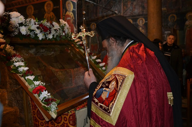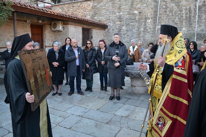 Μετά την υποδοχή που έγινε με τη δέουσα λαμπρότητα και κατάνυξη τελέστηκε ο Μέγας Εσπερινός και ο παρακλητικός κανόνας του Τιμίου Σταυρού ενώ την Κυριακή τελέστηκε ο Όρθρος , η δοξολογία και η περιφορά της εικόνας και στη συνέχεια η αρχιερατική θεία λειτουργία ενώ το απόγευμα εψάλλει ο Δ΄ Κατανυκτικός Εσπερινός και αμέσως μετά η εικόνα αναχώρησε και πάλι για την Ιερά Μονή Βαρλαάμ Μετεώρων .