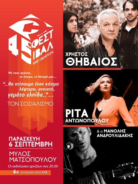 Στο Φεστιβάλ της ΚΝΕ στα Τρίκαλα, στο γνώριμο χώρο του Μύλου Ματσόπουλου θα δώσουν το παρών με μεγάλη συναυλία οι γνωστοί καλλιτέχνες Χρήστος Θηβαίος , Ρίτα Αντωνοπούλου & Μανόλης Ανδρουλιδάκης στις 6 Σεπτέμβρη.