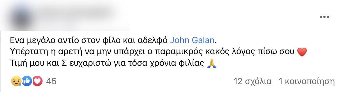 Ο αντιδήμαρχος Τουρισμού του Δήμου Αγιάς, Νίκος Ντάγκας έγραψε: “Το αντιο..δεν βγαινει. Το γιατι…θα μεινει αναπαντητο. Ειναι δεδομενο ομως.. οτι θα εισαι μαζι μας ,στα ονειρα ,στις σκεψεις στα γελια στην παρεα στις ανεξερευνητες ομορφιες του τοπου μας στα σχεδια… Τα λεμε Γιαννη. Καλη δυναμη και τα ειλικρινη συλλυπητηρια στην οικογενεια σου».