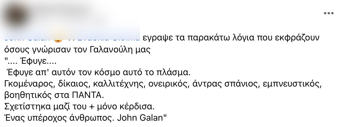 Λίγες ώρες μετά την θλιβερή είδηση για τον θάνατό του, ο παρουσιαστής Πέτρος Πολυχρονίδης αποχαιρετά τον Γιάννη Γαλανούλη με ανάρτησή του στο facebook, δημοσιεύοντας κοινές τους φωτογραφίες. «Δεν φεύγουν έτσι οι άνθρωποι ρε Γιάννη. Όχι έτσι. Όχι τώρα φίλε», έγραψε ο παρουσιαστής του Star.