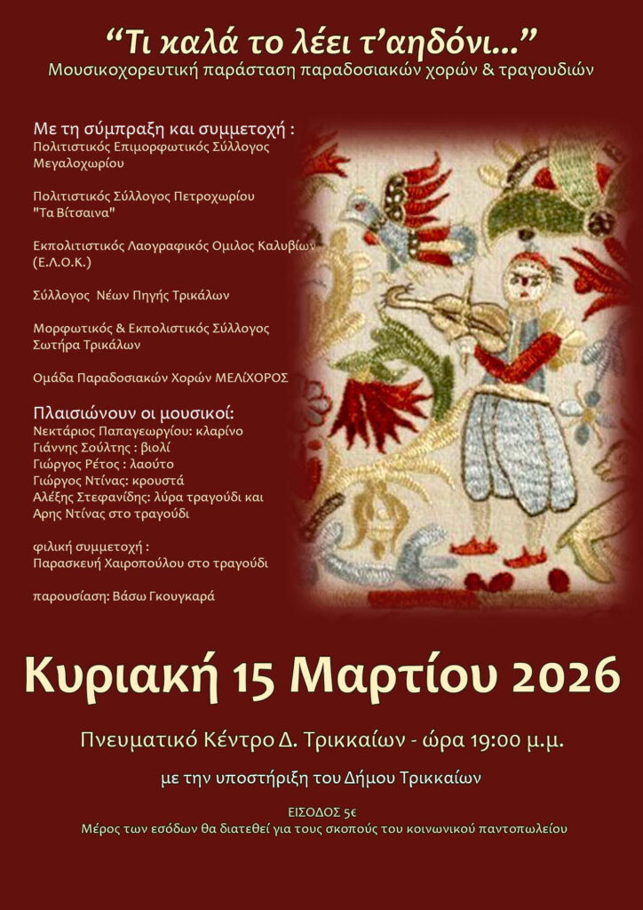 trikaladay.gr / Τοπικά / «Τι καλά το λέει τ’ αηδόνι…» αυτή την Κυριακή στο Πνευματικό Κέντρο Τρικάλων