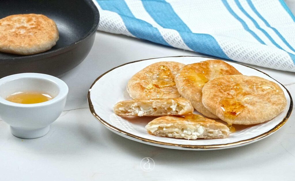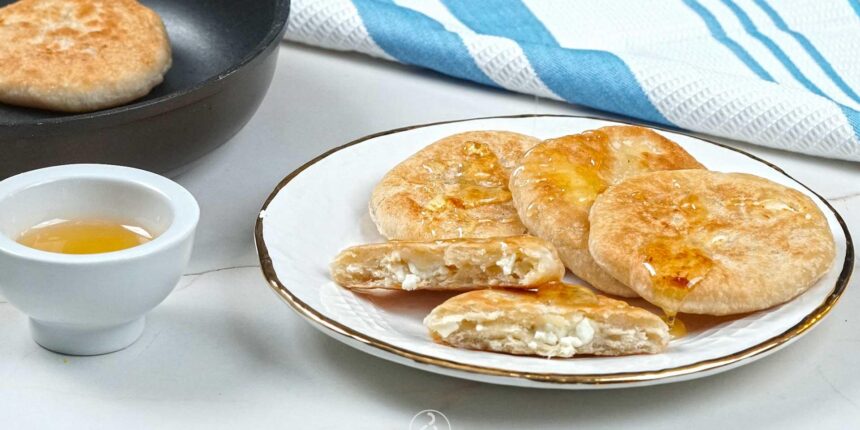 Γεμίζουμε τις τηγανίτες με τυρί με λίγα τρίμματα φέτας και κλείνουμε σε μπαλίτσα να καλυφθεί το τυρί.