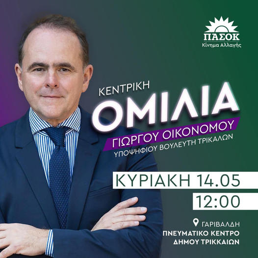 Την Κυριακή 15/5 θα πραγματοποιηθεί η κεντρική προεκλογική ομιλία του υποψήφιου βουλευτή ΠΑΣΟΚ Τρικάλων Γιώργου Οικονόμου.