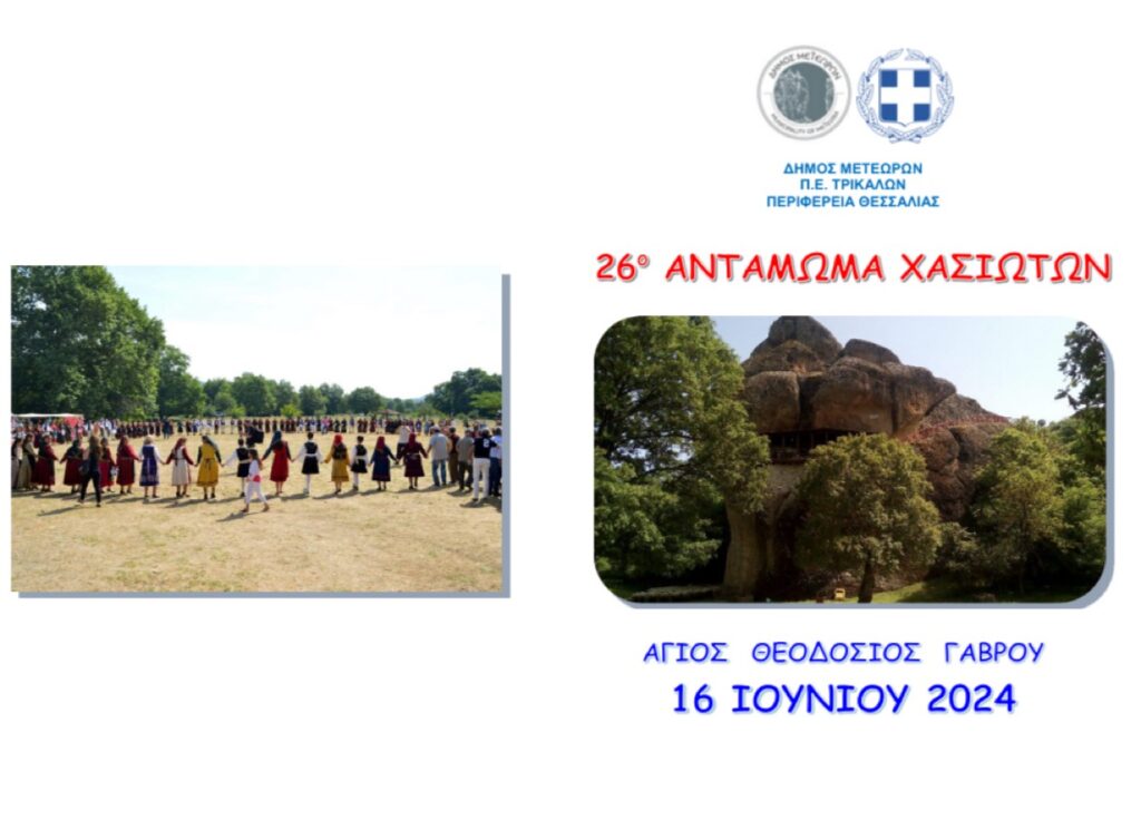 Την Κυριακή 16 Ιουνίου 2024 ο Δήμος Μετεώρων σε συνεργασία με την Περιφέρεια Θεσσαλίας και τους Πολιτιστικούς Συλλόγους Χασίων διοργανώνουν το 26ο Αντάμωμα Χασιωτών στον Άγιο Θεοδόσιο Γάμβρου.