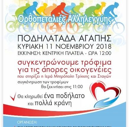 Την Κυριακή 11/11/2018 γρασάρουμε τις αλυσίδες του ποδηλάτου μας ελέγχουμε τα φρένα και τα λάστιχα και με σημείο συνάντησης την Κεντρική Πλατεία πάμε για φιλανθρω-πεταλιές. Από το πρωί στις 11:00 συγκεντρώνουμε τρόφιμα για το συσσίτιο των ατόμων που στηρίζει η Ιερά Μητρόπολη Τρίκκης και Σταγών.