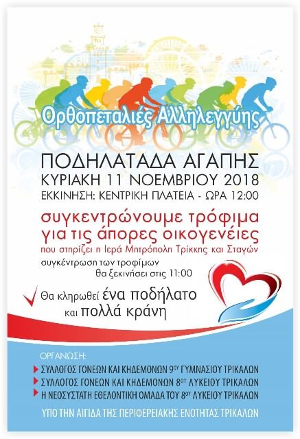 Την Κυριακή 11/11/2018 γρασάρουμε τις αλυσίδες του ποδηλάτου μας ελέγχουμε τα φρένα και τα λάστιχα και με σημείο συνάντησης την Κεντρική Πλατεία πάμε για φιλανθρω-πεταλιές. Από το πρωί στις 11:00 συγκεντρώνουμε τρόφιμα για το συσσίτιο των ατόμων που στηρίζει η Ιερά Μητρόπολη Τρίκκης και Σταγών.