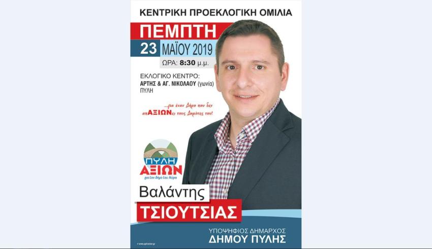 Ο Υποψήφιος Δήμαρχος Πύλης κ. Βαλάντης Τσιούτσιας και τα μέλη του συνδυασμού «ΠΥΛΗ ΑΞΙΩΝ», σας προσκαλούν στην κεντρική προεκλογική ομιλία που θα πραγματοποιηθεί την ΠΕΜΠΤΗ 23 ΜΑΪΟΥ 2019 και ώρα 8.30 μ.μ., στο Εκλογικό Κέντρο, Άρτης & Αγίου Νικολάου (γωνία) στην Πύλη.