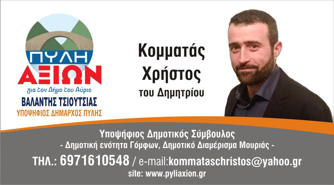 Ο Χρήστος Κομματάς διεκδικεί την ψήφο των συνδημοτών του καθώς είναι υποψήφιος σύμβουλος με τον συνδυασμό του Βαλάντη Τσιούτσια “Πύλη Αξιών”.
