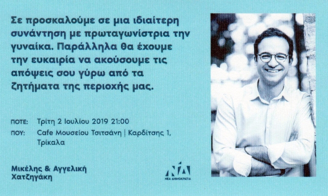 Θα είναι μια χαλαρή εκδήλωση γνωριμίας με τον νέο Τρικαλινό πολιτικό που αναγνωρίζει την σημαντική αποστολή των Τρικαλινών γυναικών τόσο ως μάνες και στυλοβάτες των οικογενειών τους, όσο και ως εργαζόμενες όταν το έργο τους είναι ακόμη πιο δύσκολο.