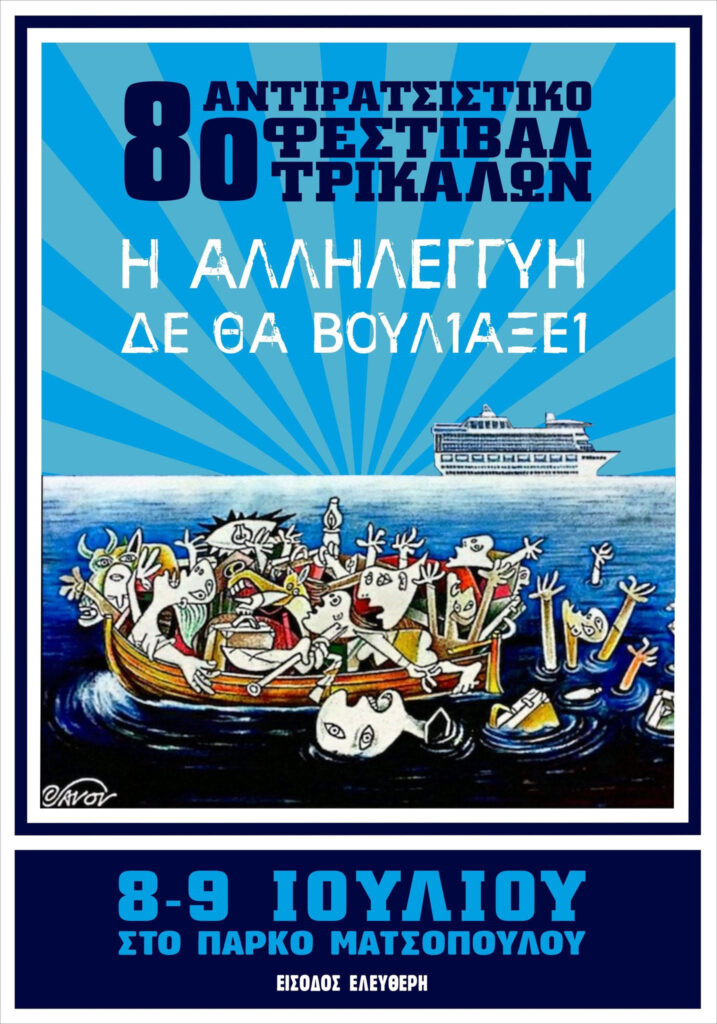Το 8o ΑΝΤΙΡΑΤΣΙΣΤΙΚΟ ΦΕΣΤΙΒΑΛ ΤΡΙΚΑΛΩΝ είναι εδώ, στο γνώριμο καλοκαιρινό ραντεβού στο πάρκο Ματσόπουλου, 8-9 Ιουλίου με δωρεάν είσοδο! Με κεντρικό σύνθημα «Η ΑΛΛΗΛΕΓΓΥΗ ΔΕ ΘΑ ΒΟΥΛΙΑΞΕΙ» υπόσχεται ένα πλούσιο πολιτικό και πολιτιστικό πρόγραμμα στα πλαίσια του οποίου, μέσα από συζητήσεις, συναυλίες, θεματικά εργαστήρια, φιλοδοξούμε τις δυο αυτές μέρες το φεστιβάλ φιλοδοξούμε να αποτελέσει μια συλλογική διαδικασία αναζήτησης και συζήτησης για θέματα κοινωνικής και πολιτικής διαπάλης, για να μοιραστούμε τις αγωνίες και τις σκέψεις μας κόντρα στον συμβιβασμό, την υποχωρητικότητα και την εκμετάλλευση.