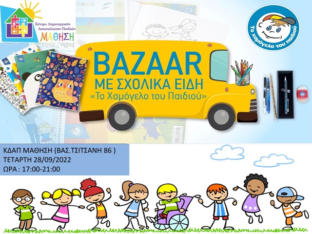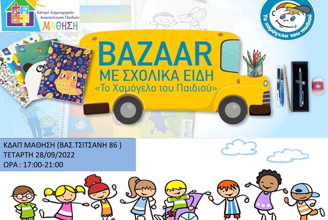 φιλανθρωπικό μπαζάρ με σχολικά είδη στην αυλή της δομής.