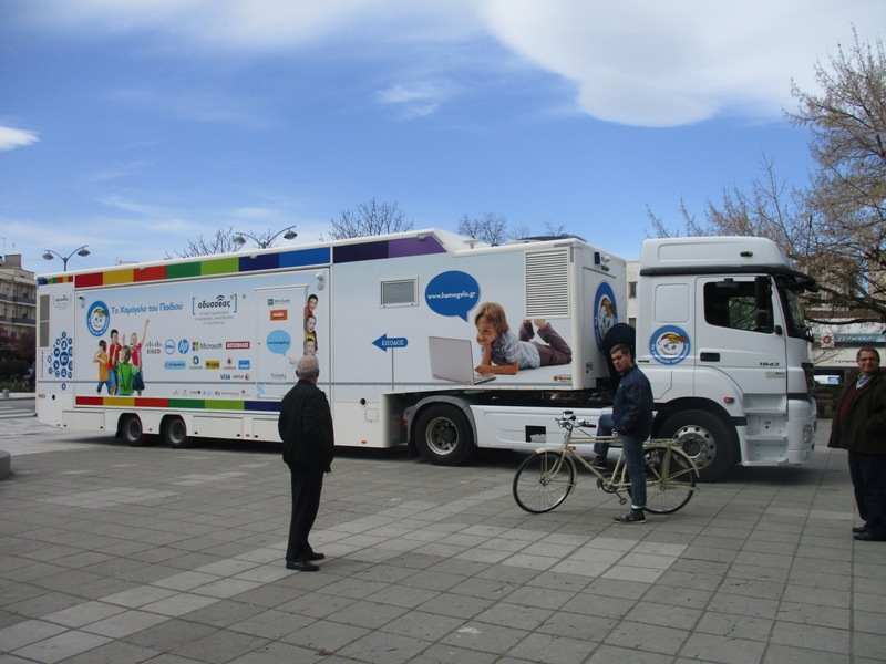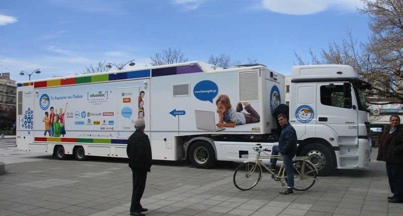 Πρόκειται για το Κινητό Εργαστήριο Ενημέρωσης Εκπαίδευσης και Τεχνολογίας του «Χαμόγελου του παιδιού» που περιοδεύει σε όλη τη χώρα στον πλαίσιο του προγράμματος «Οδυσσέας».