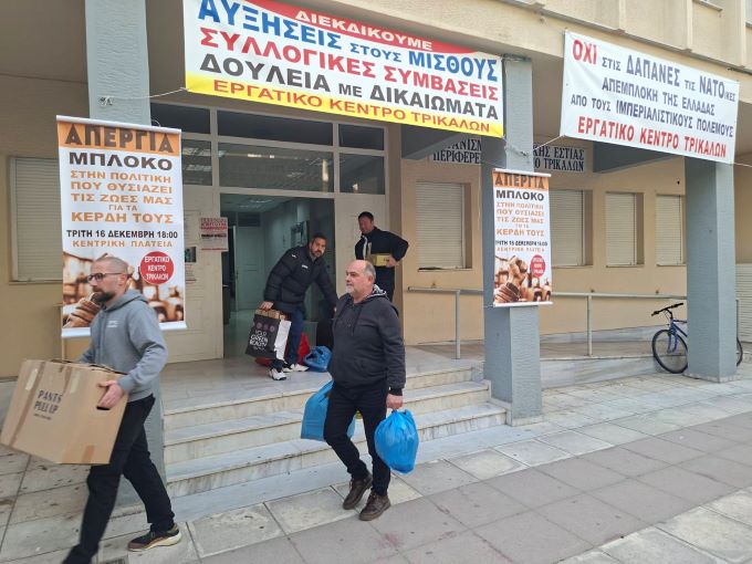 Το Εργατικού Κέντρου Ν. Τρικάλων μετά από κάλεσμα του προς τους εργαζόμενους και το λαό της πόλης μας να ανταποκριθούν για να συγκεντρωθούν άμεσα είδη πρώτης ανάγκης για πρόσφυγες (για άντρες ρούχα, παπούτσια και άλλα είδη ατομικής υγιεινής ) στα πλαίσια της αλληλεγγύης στους πρόσφυγες που βρίσκονται στο ΚΥΤ στο Κουτσόχερο Λάρισας στέφτηκε με επιτυχία και μαζικότητα. Τα είδη αυτά παραδόθηκαν στους ανθρώπους που τα είχαν ανάγκη.