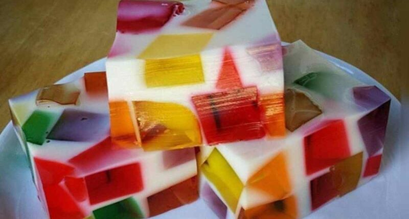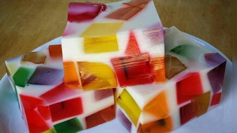 Αρχικά διαλύουμε το κάθε ζελέ ξεχωριστά σε 1 ποτήρι βραστό νερό. Αδειάζουμε το κάθε ζελέ σε τάπερ ώστε να έχουν λίγο πάχος, έτσι ώστε να το κόψουμε σε παρόμοια κυβάκια μετά. Βάζουμε τα ζελέ στο ψυγείο και τα αφήνουμε εκεί να πήξουν πολύ καλά.