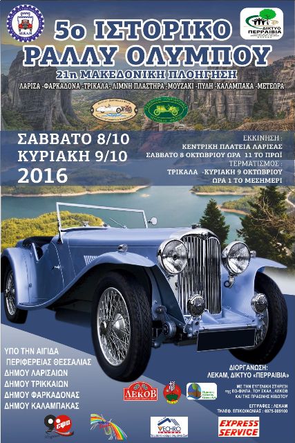 Έντονο είναι το ενδιαφέρον πολλών οδηγών να λάβουν μέρος στο περίφημο Ιστορικό Ράλλυ Ολύμπου 2016, γι’ αυτό και επικρατεί εγρήγορση στις τάξεις των μεγαλύτερων Λεσχών κλασσικών αυτοκινήτων σε όλη την Ελλάδα, για το αυθεντικό και εντυπωσιακό 5ο Ιστορικό Ράλι Όλυμπου 2016 (21η Μακεδονική Πλοήγηση) ,που θα πραγματοποιηθεί φέτος στις 8 και 9 Οκτωβρίου 2016 και διοργανώνεται από τον Φορέα Πολιτισμού και Επιστημών Δίκτυο “ΠΕΡΡΑΙΒΙΑ” (Ελασσόνα -Θεσσαλία) και την παντοδύναμη Λέσχη Κλασσικών Αυτοκινήτων Μακεδονίας (ΛΕΚΑΜ- Θεσσαλονίκη ) ,με την υποστήριξη της FIVA, της ΕΟ-ΦΙΛΠΑ ,της Λέσχης Κλασσικών Οχημάτων Βόλου (ΛΕΚΟΒ) ,του Συλλόγου Κλασσικών Αυτοκινήτων Λάρισας (ΣΚΑΛ) και της Εθελοντικής Οργάνωσης «ΠΡΑΣΙΝΗ ΚΙΒΩΤΟΣ» -Τρίκαλα , υπό την Αιγίδα της Περιφέρειας Θεσσαλίας και των Δήμων Λάρισας , Φαρκαδόνας, Τρικκαίων και Καλαμπάκας .