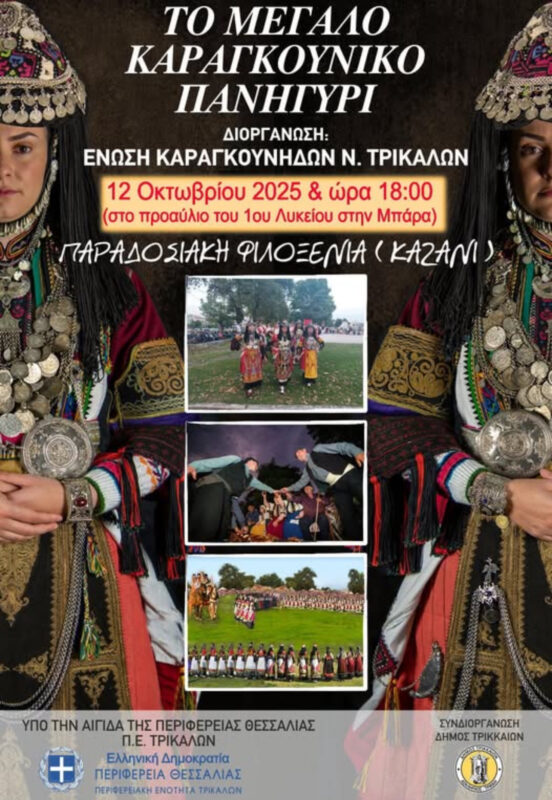 Μετά την αναβολή, που είχε ανακοινωθεί λόγω καιρού, το Μεγάλο Καραγκούνικο Πανηγύρι, η μεγάλη γιορτή της παράδοσης και της πολιτιστικής κληρονομιάς των Καραγκούνηδων, επιστρέφει δυναμικά. Η Ένωση Καραγκούνηδων Ν. Τρικάλων καλεί όλο τον κόσμο σε μια γιορτή παράδοσης και πολιτισμού, την Κυριακή 12 Οκτωβρίου 2025, στις 18:00, στο προαύλιο του 1ου Λυκείου στην Μπάρα Τρικάλων.