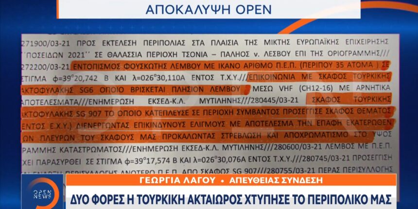 Την απόρρητη αναφορά του λιμενικού σώματος στη Μυτιλήνη για το περιστατικό παρενόχλησης ελληνικού σκάφους από τουρκική ακταιωρό στις 28 Μαρτίου έφερε απόψε στο φως το κεντρικό δελτίο ειδήσεων του ΟΡΕΝ. Στο απόρρητο έγγραφο του Λιμενικού περιγράφεται καρέ – καρέ η απόπειρα εμβολισμού ελληνικού περιπολικού από τουρκική ακταιωρό, στη θαλάσσια περιοχή της Λέσβου.