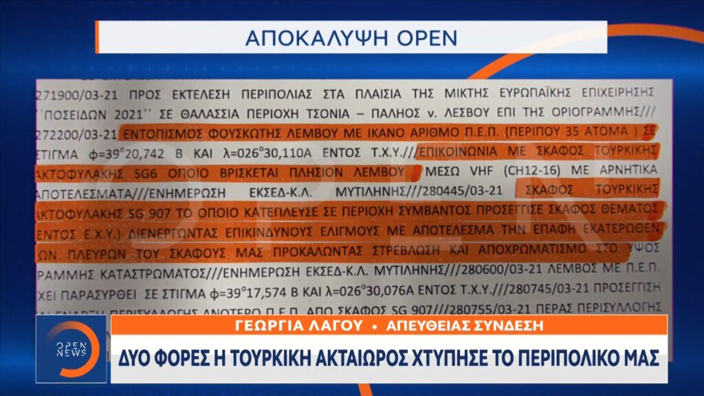 Την απόρρητη αναφορά του λιμενικού σώματος στη Μυτιλήνη για το περιστατικό παρενόχλησης ελληνικού σκάφους από τουρκική ακταιωρό στις 28 Μαρτίου έφερε απόψε στο φως το κεντρικό δελτίο ειδήσεων του ΟΡΕΝ. Στο απόρρητο έγγραφο του Λιμενικού περιγράφεται καρέ – καρέ η απόπειρα εμβολισμού ελληνικού περιπολικού από τουρκική ακταιωρό, στη θαλάσσια περιοχή της Λέσβου.
