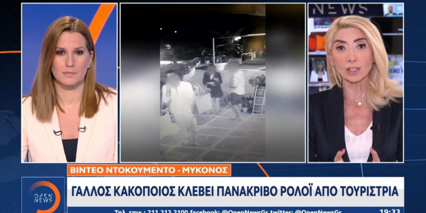 Ένα αποκαλυπτικό βίντεο που καταγράφει τον τρόπο, με τον οποίο Γάλλοι κακοποιοί αρπάζουν το πανάκριβο ρολόι μιας γυναίκας που το φορά στο χέρι έφερε στο φως της δημοσιότητας το κεντρικό δελτίο ειδήσεων του ΟΡΕΝ. Πρόκειται για την πιο διαδεδομένη μορφή κλοπής το καλοκαίρι στη Μύκονο και όπως αποτυπώνεται σε βίντεο ασφαλείας, ο δράστης προσποιείται ότι είναι υπό την επήρεια αλκοόλ και αφού έχει εντοπίσει τη γυναίκα, αρχίζει να χορεύει, την αρπάζει αγκαλιά και με ταχυδακτυλουργικό τρόπο καταφέρνει να της αρπάξει το ρολόι. Μετά την καταγγελία του θύματος, οι αστυνομικοί του τμήματος Μυκόνου κατάφεραν να συλλάβουν τον κλέφτη ρολογιών, ενώ έχουν στείλει επείγον σήμα αναζητώντας τον συνεργό του.