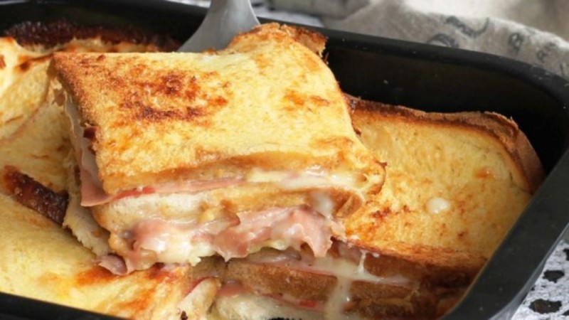 • Σε ένα ταψί βάζουμε μια στρώση από τις φέτες ψωμιού, στη συνέχεια καλύπτουμε με τυρί και ζαμπόν και από πάνω προσθέτουμε ξανά τις φέτες και συνεχίζουμε μέχρι να τελειώσουν όλα τα υλικά.