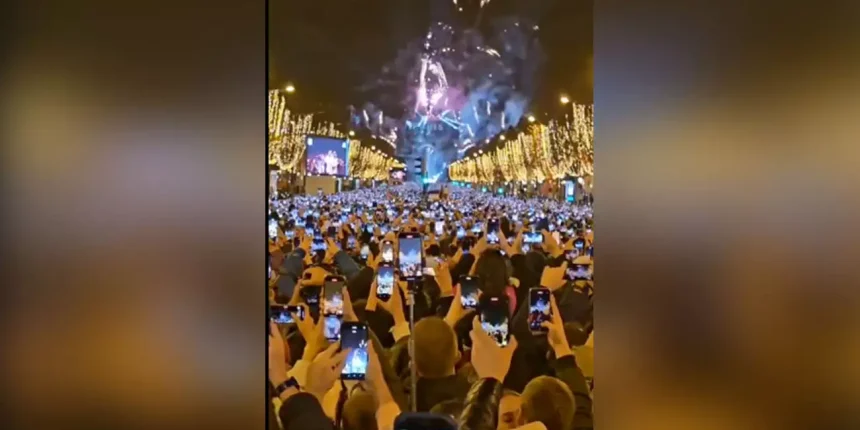 Χιλιάδες άνθρωποι στα Ηλύσια Πεδία την ώρα που άρχισε η αντίστροφη μέτρηση για την Πρωτοχρονιά του 2024 σήκωσαν τα κινητά τους για να καταγράψουν σε βίντεο ή φωτογραφίες τα βεγγαλικά.