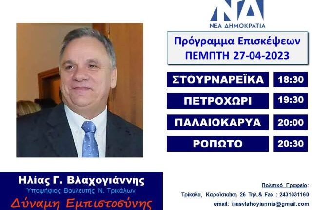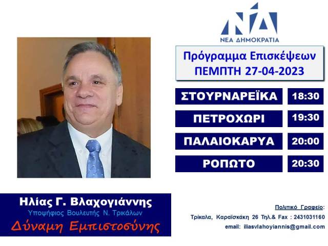 Το πρόγραμμα επισκέψεων του Ηλία Βλαχογιάννη την Πέμπτη 27 Απριλίου Κωνσταντίνος Καραποστόλης 26/04/2023 14:11 Τοπικά 2 Εμφανίσεις Το πρόγραμμα επισκέψεων του Ηλίας Βλαχογιάννη την Πέμπτη 27 Απριλίου 2023 Post Views: 63 2023-04-26 Κωνσταντίνος Καραποστόλης Μοιράσου το Facebook Twitter