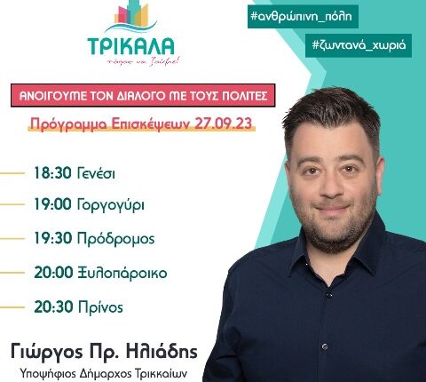 Το πρόγραμμα επισκέψεων του υποψήφιου δημάρχου Τρικάλων με τον συνδυασμό “Τρίκαλα τόπος να ζούμε” Γ. Ηλιάδη την Τετάρτη 27 Σεπτεμβρίου