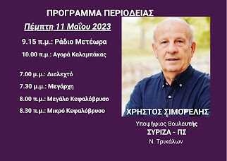 Το πρόγραμμα περιοδειών του Χρ. Σιμορέλη την Πέμπτη 11/5