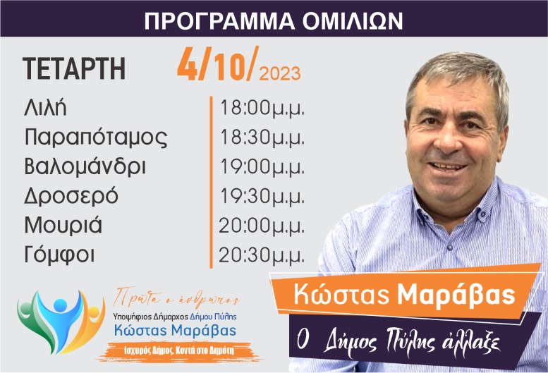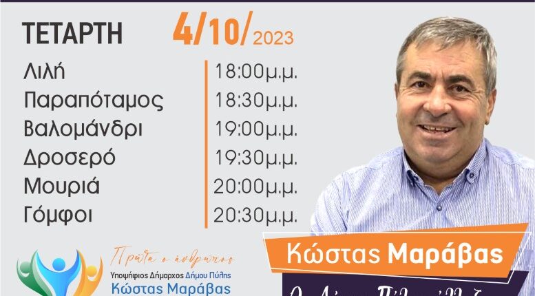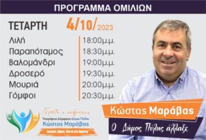 Το πρόγραμμα περιοδειών του συνδυασμού ΠΡΩΤΑ Ο ΑΝΘΡΩΠΟΣ του Κώστα Μαράβα την Τετάρτη 04/10/ 2023