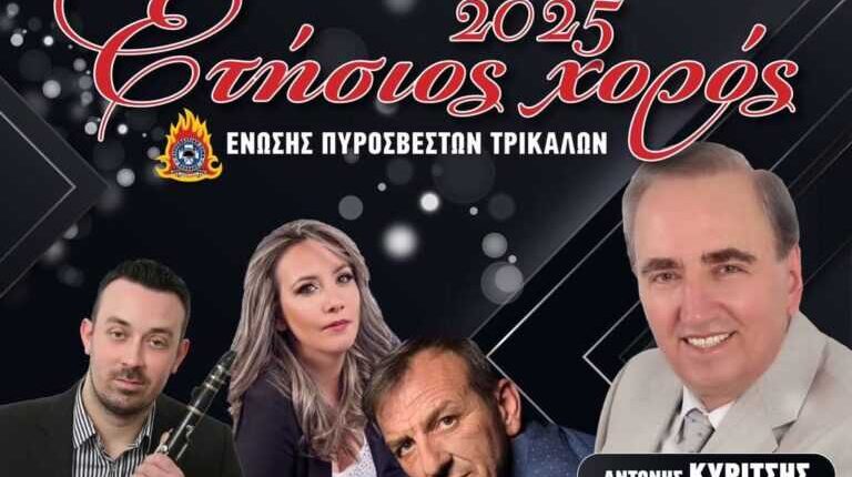 Η Ένωση Πυροσβεστών Τρικάλων σας προσκαλεί στον Ετήσιο Χορό 2025, που θα πραγματοποιηθεί το Σάββατο 1 Φεβρουαρίου 2025 στις 21:00, στο Νεράιδα Κέντρο Διασκέδασης (7ο χλμ. Τρικάλων – Καλαμπάκας).
