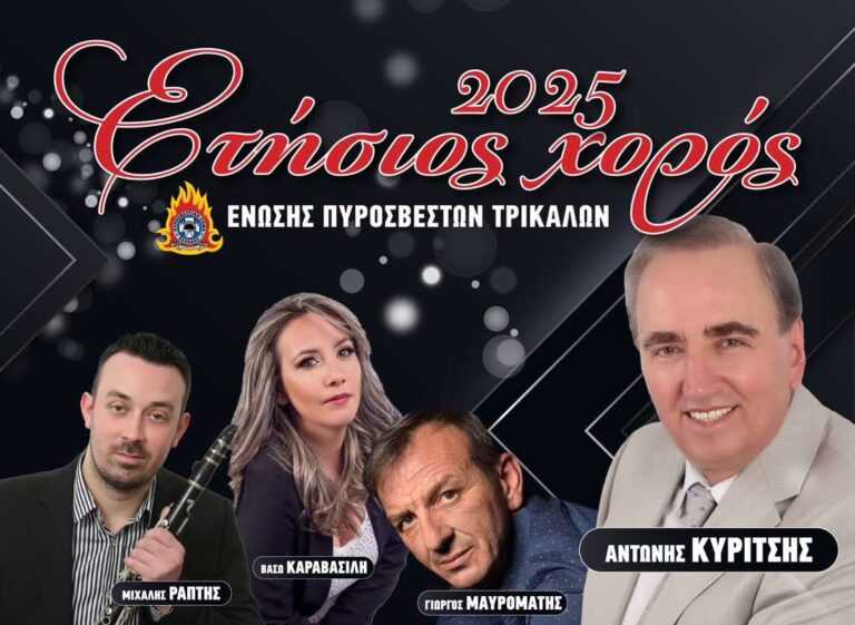 Η Ένωση Πυροσβεστών Τρικάλων σας προσκαλεί στον Ετήσιο Χορό 2025, που θα πραγματοποιηθεί το Σάββατο 1 Φεβρουαρίου 2025 στις 21:00, στο Νεράιδα Κέντρο Διασκέδασης (7ο χλμ. Τρικάλων – Καλαμπάκας).