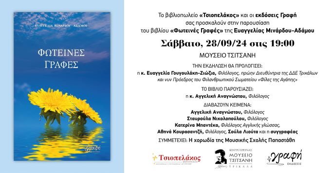 Την εκδήλωση προλογίζει η κ. Ευαγγελία Γουγουλάκη – Ζιώζια, Φιλόλογος, πρώην Διευθύντρια της ΔΔΕ Τρικάλων και νυν Πρόεδρος του Φιλανθρωπικού Σωματείου “Φίλες της αγάπης”,