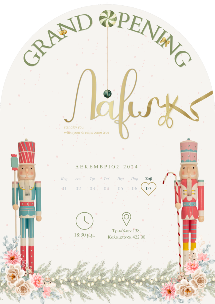 Η αγάπη για τη δημιουργία και η αφοσίωση στη λεπτομέρεια μας οδηγούν σε ένα νέο κεφάλαιο! Με μεγάλη χαρά, σας προσκαλούμε στα εγκαίνια του Studio Lafo το Σάββατο, 7 Δεκεμβρίου 2024 και ώρα 18:30, στη διεύθυνση Τρικάλων 138, Καλαμπάκα.