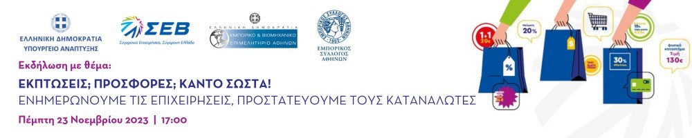 Το Υπουργείο Ανάπτυξης σε συνεργασία με τον Σύνδεσμο Επιχειρήσεων και Βιομηχανιών (ΣΕΒ), το Εμπορικό και Βιομηχανικό Επιμελητήριο Αθηνών (ΕΒΕΑ) και τον Εμπορικό Σύλλογο Αθηνών (ΕΣΑ) διοργανώνουν την Πέμπτη 23 Νοεμβρίου 2023 στις 17:00, στο Αμφιθέατρο του ΕΒΕΑ, την ενημερωτική εκδήλωση “Εκπτώσεις; Προσφορές; Κάντο σωστά!”. Στην εκδήλωση θα παρουσιαστούν το νομικό πλαίσιο των εκπτώσεων και των προσφορών, ο Εικονογραφημένος Οδηγός των εκπτώσεων, ενώ πρόκειται να δοθούν απαντήσεις σε ερωτήματα της αγοράς.