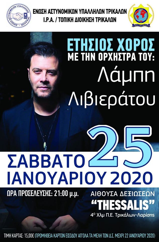Η Ένωση Αστυνομικών Υπαλλήλων Τρικάλων και η Ι.Ρ.Α. Τρικάλων, συνδιοργανώνουν τον ετήσιο χορό τους για το έτος 2020, το Σάββατο 25 Ιανουαρίου 2020 και ώρα 21.00΄ στην Αίθουσα Δεξιώσεων «THESSALIS» (4o Χλμ. Π.Ε. Τρικάλων- Λαρίσης/ Τρίκαλα).