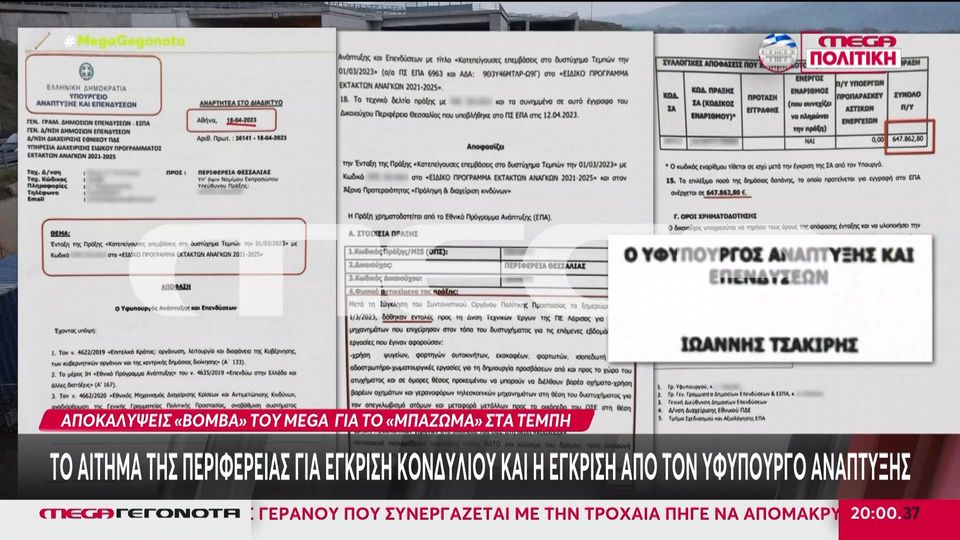 Ένα ακόμη έγγραφο ντοκουμέντο που έρχεται στο φως της δημοσιότητας είναι η έγκριση από το υπουργείο Aνάπτυξης κονδυλίου ύψους 647.862,80 ευρώ, που αιτείται η Περιφέρεια Θεσσαλίας για έργα στον χώρο της τραγωδίας και στο Κουλούρι, τα οποία όπως αποκαλύπτεται, ξεκίνησαν ελάχιστες ώρες μετά το δυστύχημα. Tην έγκριση για την εκταμίευση του ποσού υπογράφει ο υφυπουργός Ανάπτυξης και Επενδύσεων, Ιωάννης Τσακίρης.