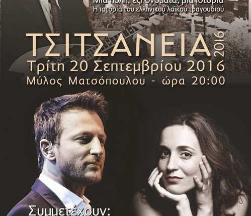 Η Περιφερειακή Ενότητα Τρικάλων της Περιφέρειας Θεσσαλίας διοργανώνει την αναβληθείσα κεντρική εκδήλωση των «Τσιτσανείων 2016» αυτή την Τρίτη 20 Σεπτεμβρίου 2016 και ώρα 20:00 στον Μύλο Ματσόπουλου.