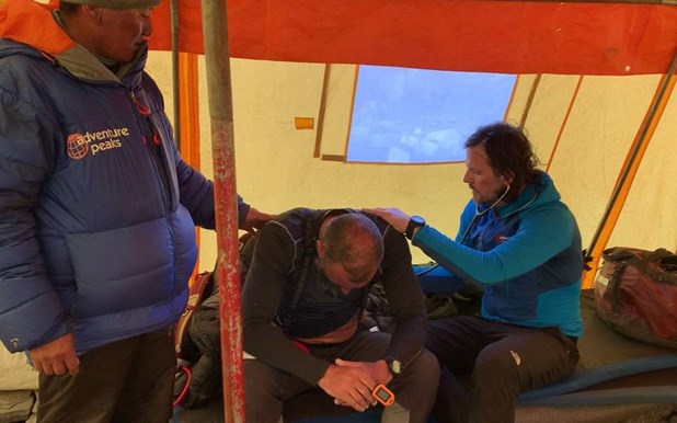 Είχε πλέον νυχτώσει κατά την άφιξή τους στην κατασκήνωση βάσης. «Ηταν 10:30 μ.μ. όταν έβαλα τον ασθενή στην ειδικά διαμορφωμένη σκηνή, πλήρως εξοπλισμένη, για να τον εξετάσω. Εκεί εκτίμησα ότι η κατάστασή του ήταν κρίσιμη. Ο αριστερός του πνεύμονας υπολειτουργούσε και ήταν σημαντικά αφυδατωμένος. Επίσης, οι δείκτες του καρδιακού ρυθμού, της αρτηριακής πίεσης μαζί με τον ρυθμό αναπνοής, τον κορεσμό οξυγόνου και τη θερμοκρασία ήταν μη φυσιολογικά. Του χορήγησα ενδοφλέβια υγρά και του έδωσα θεραπευτική αγωγή κατάλληλη για ότι είχε εκτιμήσει ότι είχε αλλά και προσαρμοσμένη στις συνθήκες που βρισκόμασταν», εξιστορεί ο Γιώργος.
