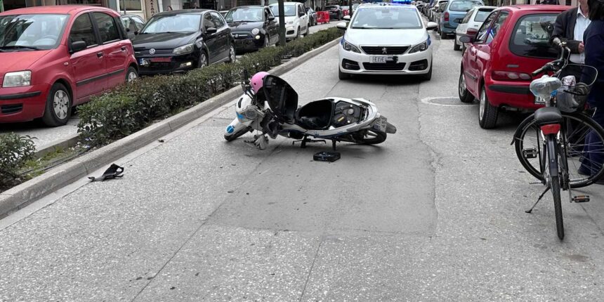 Οπως κατέγραψε το trikaladay, δυο νεαροί επιβαίνοντες σε μηχανάκι για να αποφύγουν μια πεζή που διέσχιζε κάθετα τον δρόμο, προσέκρουσαν πάνω σε καθρέφτη σταθμευμένου αυτοκινήτου.