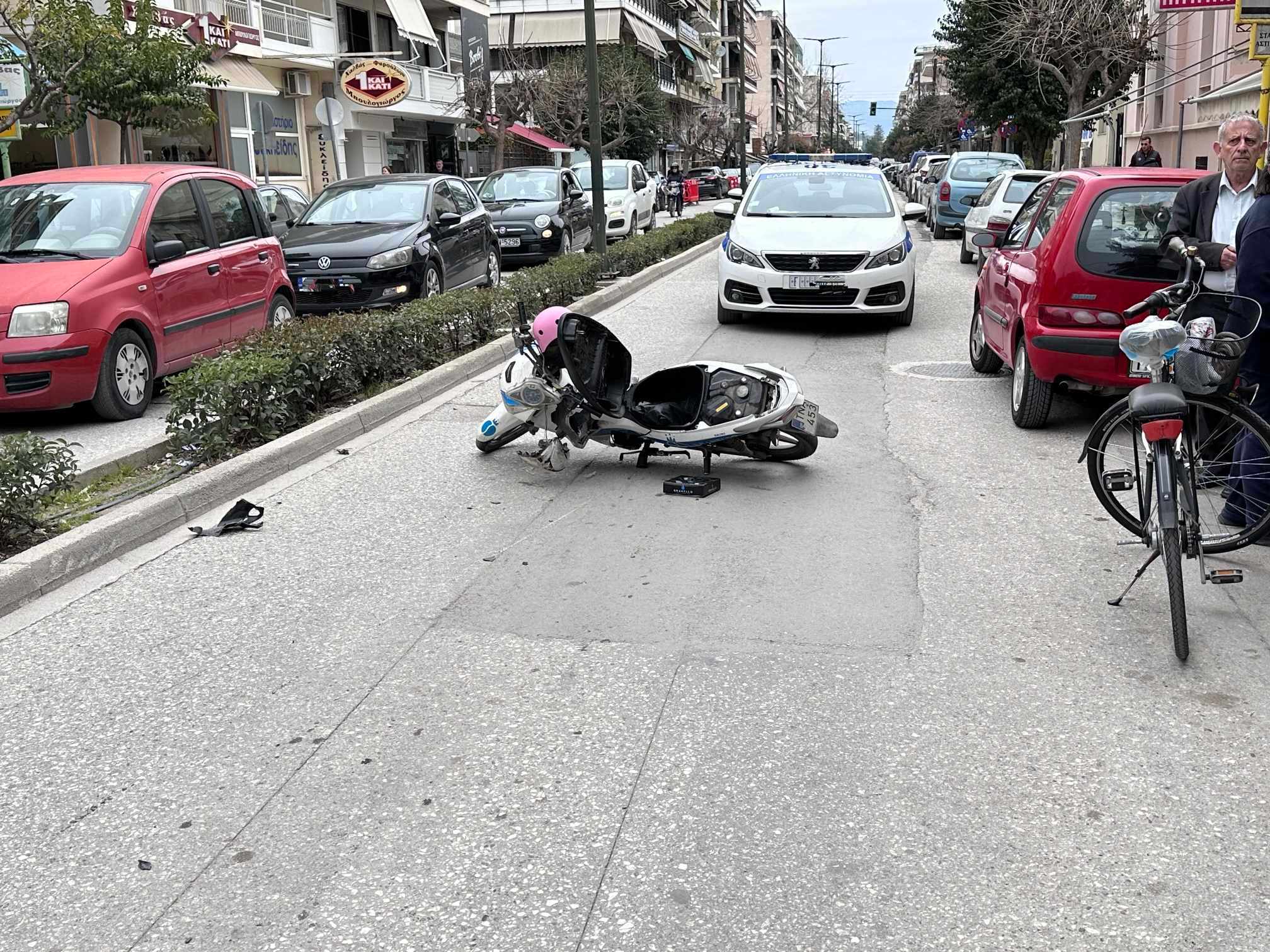 Οπως κατέγραψε το trikaladay, δυο νεαροί επιβαίνοντες σε μηχανάκι για να αποφύγουν μια πεζή που διέσχιζε κάθετα τον δρόμο, προσέκρουσαν πάνω σε καθρέφτη σταθμευμένου αυτοκινήτου.