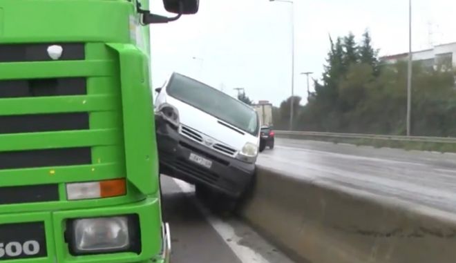 Βυτιοφόρο γλίστρησε στον βρεγμένο δρόμο και έπεσε πάνω σε προπορευόμενα οχήματα, στην Εγνατία οδό, στο ύψος της διασταύρωσης με την παλιά εθνική οδό Θεσσαλονίκης – Καβάλας λόγω της έντονης κακοκαιρίας.