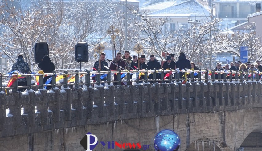 Στην γέφυρα “Γκίκα” στην Πύλη & με φόντο το χιονισμένο τοπίο, πραγματοποιήθηκε σήμερα Κυριακή 6 Ιανουαρίου 2019, ανήμερα των «Φώτων» η κατάδυση του σταυρού & ο καθιερωμένος αγιασμός των υδάτων, με βασικό χαρακτηριστικό για εφέτος το δριμύ ψύχος!